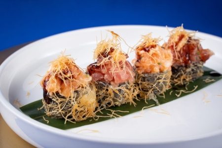 Roll di riso avvolto nell’alga nori, avocado, con spicy tuna, spicy salmono, kataifi