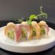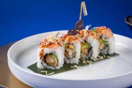 Roll di riso con alga nori, gambero in tempura e avocado, guarnito con carpaccio di salmone, salsa teriyaki e imo