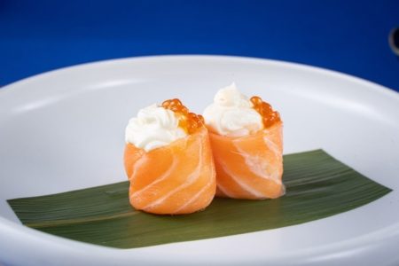 Bocconcino di riso avvolto nel carpaccio di salmone guarnito con philadelphia, ikura