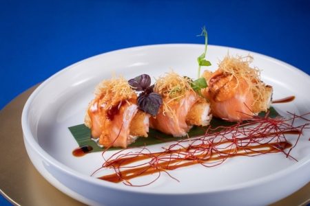 Tempura di gambero, salmone, teriyaki e kataifi
