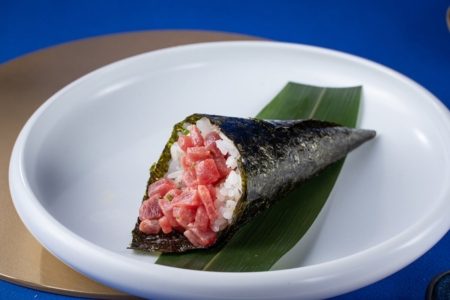 Cono di riso avvolto con alga nori,, tartare di tonno e salsa piccante