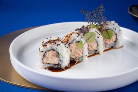 Roll di riso con alga nori, salmone cotto, philadelphia, salsa teriyaki