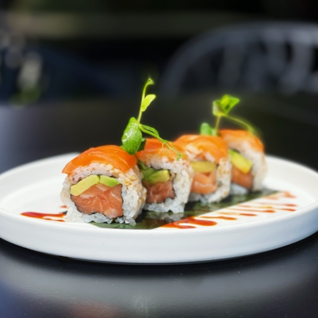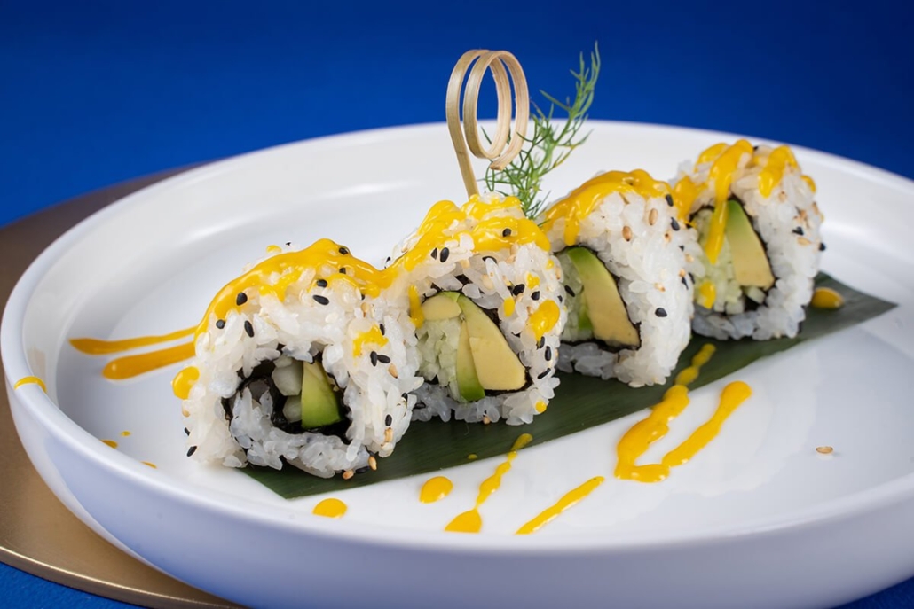 Roll di riso con alga nori, cetriolo, avocado,, con salsa mango
