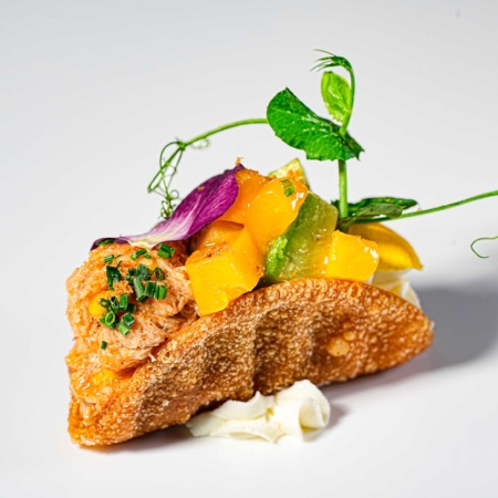 Bruschetta con tartare di salmone speziato e salsa avocado