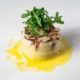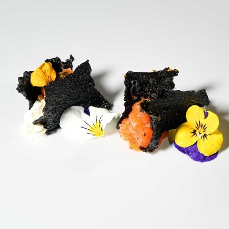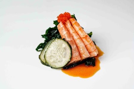 Mazzancolle cotte su letto di alghe, cetrioli marinati, ponzu e olio di sesamo
