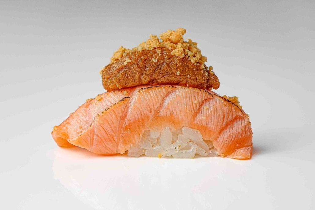 Bocconcino di riso con fetta di salmone scottato e salsa arachidi