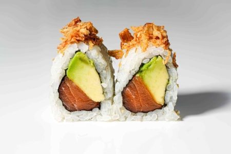 Roll di riso con alga nori, all’interno avocado, philadelphia, salmone top di cipolla croccante e sasa teriyaki