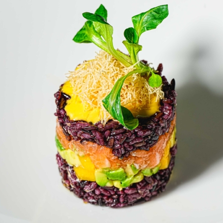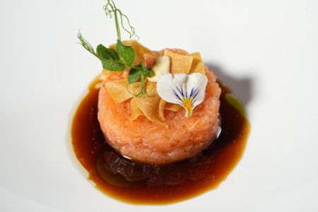 Tartara di salmone speziata con sale, pepe, olio evo e salsa ponzu
