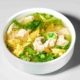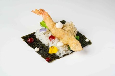 Cono di riso avvolto con alga nori, tempura di gamberi, insalata, salsa maionese, salsa banana e imo