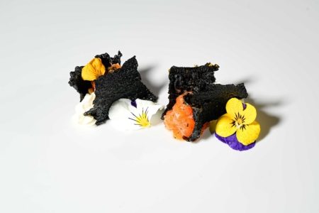 Sfoglia di alghe fritte, philadelphia, tartare di salmone speziato, erba cipollina, salsa di sesamo dressing e crema tartufo
