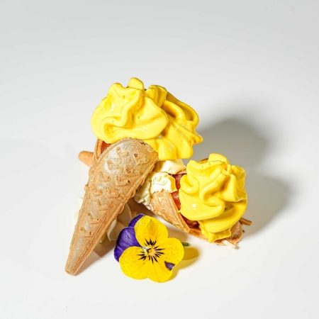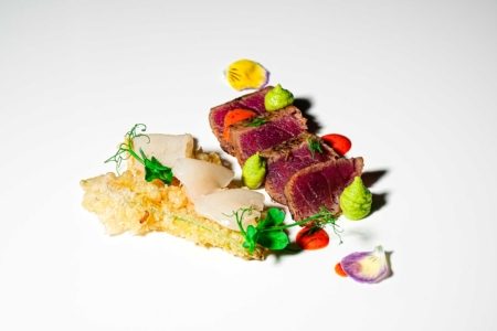 Tonno affumicato poi scottato e carpaccio di capesante, servito con foglia croccante, salsa avocado e spicy