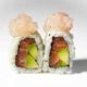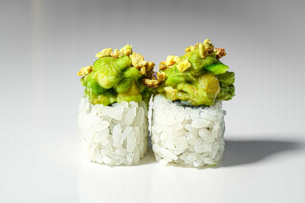 Roll di riso con interno gambero in tempura e philadelphia, esterno guacamole, salsa teriyaki e granella di pistacchio
