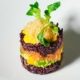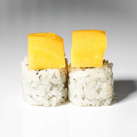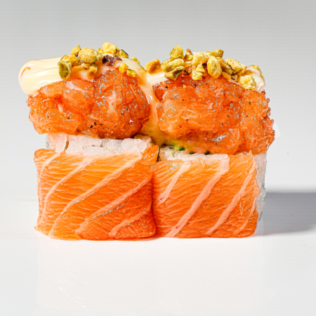 Roll di riso nero con alga nori farcito insalata, gambero in tempura, con salsa maionese, salsa banana e imo