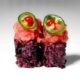 Roll di riso venere con alga nori farcito con tartare di salmone piccante, avocado guarniti con tartare di salmone, spicy maionese e jalapeno