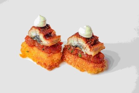 Letto di riso in tempura con top di tartara di tonno speziato olio evo, sale, pepe, anguilla e maionese