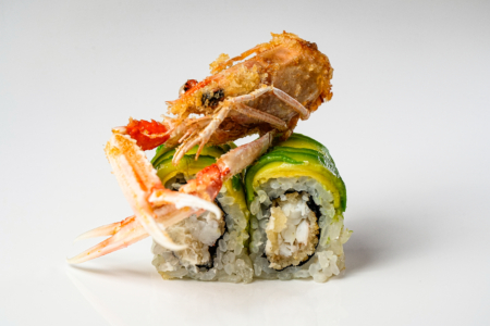 Roll di riso con interno scampi in tempura e philadelphia, guarnito con fette di avocado, polvere di frutta secca